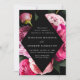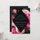 Convites florais elegantes com detalhes do seu casamento em dentro de uma armação de diamante. Lindas e vívidas peias cor-de-rosa e pinceladas, com folhas verdes e peludas cercando o quadro em um fundo preto. Os convites para o casamento de pedras revertem para uma rosa claro com espaço para texto e imagens adicionais.