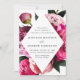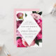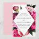 Convites florais elegantes com detalhes de seu casamento dentro de uma estrutura de diamante cercada por lindas peônias rosa vívidas e cor-de-rosa pincelada com folhas verdes e peludas. Os convites para o casamento de pedras revertem para uma rosa claro com espaço para texto e imagens adicionais.