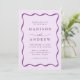 Apresentamos o convite para o casamento do Modern Black Wavy Frame, onde boho se encontra com o Retro numa celebração harmoniosa do amor! Com a inscrição roxa escura dançando sobre o fundo roxo claro, adornada com um quadro ondulado que lembra o charme vintage, este design cômico define o tom perfeito para seu dia especial. Personalizado com os nomes dos casais e os detalhes do casamento, cada elemento exumenta um ar de nostalgia e elegância moderna. Aceite o encantamento de sua união com este convite único, convidando seus convidados a se juntar à alegria de sua história de amor boho-retrô.