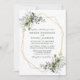 O Cartão de Convite para Casamento de Cores Biológicas Elegantes Modernos inclui folhas de eucalipto, folhagem botânica verde, folhas azuis empoeiradas e outros belos lençóis botânicos. Quadro Geométrico Dourado, Fundo Verde