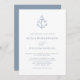 Este elegante design de convite náutico minimalista apresenta um monograma de âncora no topo com as iniciais da noiva e do noivo, com um simples fundo branco e um texto elegante clássico azul empoeirado, e um toque de caligrafia de escrita para o "e". O fundo tem um fundo azul empoeirado correspondente.