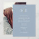 Este convite de casamento minimalista chique pode ser personalizado com as iniciais do seu monograma e os detalhes do dia do casamento em um fundo azul poeira. Com a sua foto especial no verso. Concebido por Thisisnotme