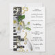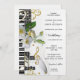 Convite de casamento com uma design elegante moderna com guitarra e chaves de piano com notas musicais de ouro estilizadas e rosas brancas frescas. Este convite tem uma área de RSVP no verso com seu próprio código QR.