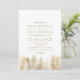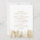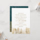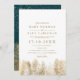 Casamento de pinheiros de inverno com pinheiros dourados mostrando uma terra maravilhosa de madeira e neve branca caindo, com tipografia elegante e moderna em branco e verde no verso. Perfeito para o inverno rústico e a celebração do casamento de Natal.