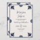 Este design de Convite para Casamento de Otomi Simples Fiesta Azul Mexicano apresenta uma simples e elegante borda, com floral azul escuro e elementos de pássaros delicadamente colocados em cada esquina. A área central é vazio à esquerda, enquadrada por uma fina linha azul, que fornece um pano de fundo limpo e minimalista para o texto. A combinação de pássaros e flores, com o uso restrito da cor, dá à design um olhar sofisticado, porém tradicional, inspirado nos mísseis folclóricos mexicanos.