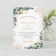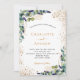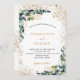 Um fundo branco decorado com verde de eucalipto e folhagem de ouro. Personalize e adicione seus nomes e detalhes do casamento. Letras pretas e ouros coloridas.