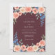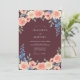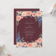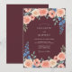 Este design apresenta um rico fundo borgonha que compensa lindamente as exuberantes rosas pêssego e delicadas flores cor-de-rosa rosado. Caules de delphinium azul profundo e folhas de sage verde-amarelado adicionam um toque de cor contrastante e textura orgânica. A estética de aquarela sombria cria uma atmosfera romântica e sofisticada para um evento noturno.