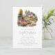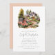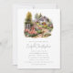 Este convite apresenta uma pintura de paisagem aquática de jardim aconchegante na primavera, com flores florescendo ao lado de uma cerca de piquete e um caminho de pedra passando por uma pequena cabana ou galpão. O nome do casal aparece no script de escrita manual moderno, com o resto do texto na fonte sans serif. A parte de trás do cartão é uma sombra coordenadora de terracota sólida pálida. Ideal para um casamento na primavera.