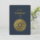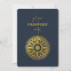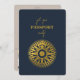 Um design de passaporte de casamento de destino azul marinho com bússola dourada e elementos viagem. Este design é ideal para todos os casamentos de Primavera, Verão, outono e inverno. Um elegante design de viagem de casamento azul e dourado com layout de passaporte, mapa mundial e foto de casal personalizada. Um design de convite de casamento de destino moderno com elementos elegantes. Também estão disponíveis itens de papelaria de casamento e outros formatos de convite de casamento.