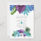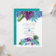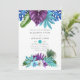 Folhas e orquídeas tropicais coloridas com cor d'água colorida, convite de casamento com uma pena de pavão e uma lama azul de turquesa inversa.