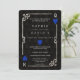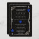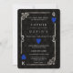 Casino Royale único, design de cartas temático art déco. Apresenta estilo art déco vintage, uma moldura quebrada do Hollywood antigo dos anos 20, com Fleur-de-lis em folha de prata falsa, corações azuis, Q e K em dois cantos (simulando cartas de baralho), sobre um fundo com padrão Art Déco. São usadas palavras especiais como num jogo de pôquer. No verso, o mesmo padrão Art Déco e iniciais entre os naipes de cartas de baralho. Use a ferramenta Personalizar para adicionar suas informações. Para mais, visite minha Coleção de Cassinos.