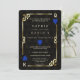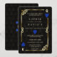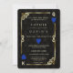 Casino Royale único, design de cartas temático art déco. Apresenta estilo art déco vintage, uma moldura quebrada antiga de Hollywood dos anos 20 com Fleur-de-lis em folha de ouro falsa, corações azuis, Q e K em dois cantos (simulando cartas de baralho), em fundo com padrão art déco preto dourado. São usadas expressões especiais como num jogo de pôquer. No verso, padrão art déco em ouro falso e iniciais entre os naipes das cartas de baralho. Use a ferramenta Personalizar para adicionar suas informações. Para mais, visite, por favor, minha Coleção de Cassinos.