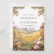 Um campo de ouro enquadrado com flores silvestres e ramos de folhas pintados suavemente estabelece uma cena rural romântica, com uma vista distante de montanha e um centro claro para seus nomes e detalhes. Esta design de aquarela se sente quente e natural para casais planejando uma celebração ao ar livre, de uma cerimônia de celeiro a uma recepção de jardim. Personalize o texto em minutos, escolha seu papel e forma, e crie um convite que se parece com pôr do sol em um campo só para vocês dois.
