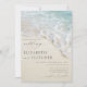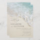 Perfeito para casamentos de destino, este elegante convite de casamento de praia de verão com um belo roteiro clássico de caligrafia mostra uma foto de proximidade de uma praia com uma onda oceânica e um mar.