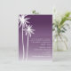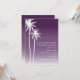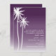 Um convite para o casamento na praia com uma ilustração de duas palmeiras brancas à esquerda sobre um fundo ombre roxo. Personalize o texto em branco.