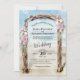 Este belo convite de casamento é perfeito para um casamento de praia ou destino. Apresenta um belo arco de madeiras flutuantes ou pergola enfeitado com rosas rosa e brancas com o oceano ao fundo.
