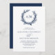 Perfeito para a praia e casamentos náuticos temáticos, uma coral enrola os monogramas da noiva e do noivo no topo desse elegante e mínimo convite litoral branco e azul marinho. A parte de trás é uma cor azul marinho sólida.