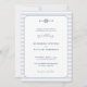 Um convite clássico elegante e moderno para o casamento com um tema náutico, com uma simples estrutura retangular arredondada sobre um fundo de listras náuticas azuis pálidas, bem como uma simples ilustração de um nó infinito náutico com um design de corda. Também apresenta os monogramas dos sotaques casal e elegantes da caligrafia. Você pode personalizar completamente este convite para o casamento do DIY. Uma escolha adorável para um casamento de barco, um casamento de iates, um casamento oceânico, um casamento à beira-mar, um casamento à beira-mar ou um casamento de praia, para um casal que ama o oceano, o mar, a praia, a navegação etc. nos meses de verão e além.