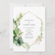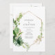 Convite de casamento de praia em verde tropical aquarela com quadro geométrico dourado personalizável para suas especificidades de evento.