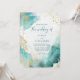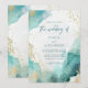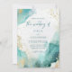 Este convite de casamento de praia moderno e abstrato apresenta respingos de tinta alcoólica azul turquesa e dourada, e fontes modernas da moda com caligrafia estilosa.