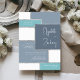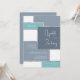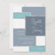 Este convite de casamento geométrico moderno apresenta um padrão de retângulos sobrepostos em azul empoeirado, vidro marinho verde e esbranquiçado, separados por bordas de folhas falsas prateadas. Os nomes da noiva e do noivo aparecem na tipografia do roteiro, com o texto restante na fonte sans serif. A parte traseira da placa é azul empoeirado sólido.