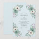 Este design botânico apresenta uma paleta serena de azul claro e verde sage, acentuada por delicados ramos de lavanda. Anêmonas e rosas pintadas à mão em aquarela criam um arranjo romântico em torno do layout. A estética é perfeita para um evento de primavera, enfatizando a beleza natural e uma atmosfera suave e arejada.
