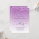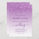Um design moderno, chic, com um fundo ombre roxo com uma borda superior de pingos de brilho roxo. A palavra "casamento" e os nomes dos primeiros casais aparecem em letras minúsculas com traços decorativos no início e no fim, com o texto restante na letra sans serif. O fundo ombre roxo e o limite de gotejamento com brilho são repetidos no sentido inverso. (Para guardar as hastes, substitua apenas as letras, deixando os símbolos no lugar.)