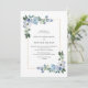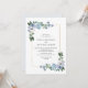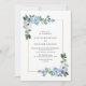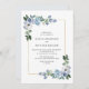 Um design azul de casamento com um dorso azul empoeirado e flores azuis e brancas pintadas com folhagem verde. Um design perfeito para o seu verão, primavera e casamento no inverno. Você pode personalizar o texto e os detalhes de cor neste modelo de convite de casamento.