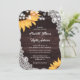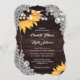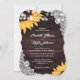 Convite para casamento de madeiras rústicas e girassóis elegantes, com girassóis e rendas florais brancas sobre um fundo de madeiras rústicas.