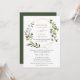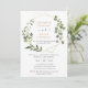 Este convite de casamento elegante e personalizável apresenta uma moldura geométrica dourada adornada com belas folhagens de verde aquarela & foi combinado com uma caligrafia caprichosa e uma fonte serif elegante em dourado e cinza. Para fazer alterações avançadas, selecione a opção "Clique para personalizar ainda mais" em Personalizar este modelo.