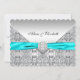 Convite de casamento com fita azul turquesa elegante e joia de diamante no centro sobre um fundo de renda prateada. Personalize com sua escolha de estilo de fonte e cor de fonte. Exclua o texto da frente para um visual mais formal. Este é um convite plano sem fitas ou rendas verdadeiras.