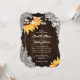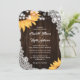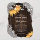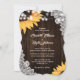 Convite de casamento floral russo com girassóis contra um fundo de madeira de celeiro adornado com rendas florais brancas e luzes de cordas. Design de cartão perfeito para convidar seus hóspedes para o seu país rústico, jardim, quintal ou festa de casamento de celeiro inspirado em flores de girassol.