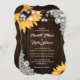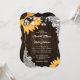Este elegante convite floral para o casamento, que inclui girassóis contra um fundo de madeira de celeiro adornado com rendas florais brancas e luzes de cordas é perfeito para convidar seus convidados para o seu país rústico, quintal ou festa de casamento de celeiro inspirado pelas flores de girassol. Personalização fácil de modelo.