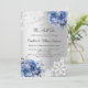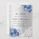 Um convite à renovação de votos moderno e elegante. Um fundo com aspecto fino prateado decorado com flores azuis, rosas e rendas brancas. Personalize e adicione seus nomes e detalhes.
