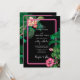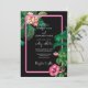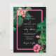 Uma moderna, mas retrorada, botânica tropical rosa-néon em fundo negro. Um belo design de casamento ideal para o verão. Design de plantas tropicais, cor-de-rosa, néon perfeito, com palmeiras, flores de Hibiscus cor-de-rosa e flores de Plumerias Frangipanis. As cores pretas, cor-de-rosa e verde dominam este design de neon rosa tropical. A tipografia da caligrafia moderna contrasta perfeitamente com o tema design do casamento preto e rosa. Um design de convite de casamento elegante com elementos simples modernos. Também estão disponíveis itens de papelaria de casamento e outros formatos de convite de casamento.