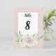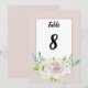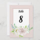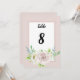 Cartões de número de mesa para festa de casamento com detalhes emoldurados com cantos acentuados superior e inferior de flores de rosas em aquarela em tons de rosa e branco com folhagem botânica em aquarela. Este conjunto de casamento floral rosa macio romântico tem rosas e folhagens em fundos rosa suave. Este conjunto tem tipografia moderna que pode ser personalizada ao seu gosto. Ótimo design da TLS Designs.