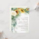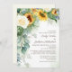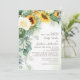 Lindo, elegante girassol amarelo, rosas brancas, eucalipto e outros verdes em um convite de casamento de cor creme botânica. Entre em contato conosco para obter ajuda sobre a personalização ou produtos correspondentes. Os nomes da noiva e do noivo estão em uma letra elegante.