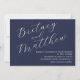 Simples convite de casamento de fotos minimalista em azul marinho com um roteiro elegante de caligrafia para noiva e noivo.