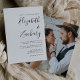 Este simples convite de casamento moderno mostra um texto negro sobre um fundo branco. Adicione os nomes da noiva e do noivo na caligrafia de escrita manual do na moda e os detalhes na fonte sans serif. Substitua facilmente a imagem de exemplo no verso por sua própria foto.