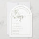 Um convite de casamento elegante e moderno, verde e branco, em forma de arco, com um sotaque escrito à mão na frase "o casamento de". Personalize a modelo com seus detalhes de casamento. © Kimbellish, LLC