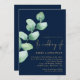 Casamento de Script de Código QR Azul e Dourado do Elegante Eucalyptus Marinho. Com o seu código QR para o seu website de casamento no fazer traseiro, esta é uma opção conveniente para todos os seus convidados para RSVP e ver todos os detalhes sem a necessidade de RSVP separado e cartões de detalhes. À esquerda, encontra-se um simples ramo de cor aquosa verde eucalipto e a redação é alinhada à direita. O Wedding Of está em um script de conjunto de estilos manuscrito e o resto do texto que você pode personalizar facilmente e digitar o URL de seu site necessário para atualizar automaticamente o código QR de amostra para levar para a sua própria página da Web escolhida.