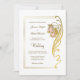 Um convite de casamento elegante com guião dourado, que inclui um quadro dourado com um embelezamento floral dourado e cor-de-rosa como parte do quadro. O texto é facilmente personalizado para que você adicione seus próprios detalhes conforme necessário.