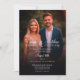 A design mostra um olhar moderno e minimalista com uma paleta de cores preta e branca. O ponto focal é a sua foto com uma elegante camada preta, A bela tipografia da escrita mostra os nomes do casal e as informações do casamento.