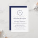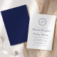 Este elegante design de convite de casamento apresenta um monograma de script azul marinho rodeado por uma coroa botânica de arte de linha em um fundo branco. Os nomes aparecem no script azul marinho, com o resto do texto na fonte de serif clássica. A parte traseira da placa é azul marinho estável.