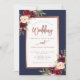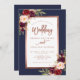 Belo design floral vermelho-burgundy com acentos de folha de ouro falso rosa e escrita à mão com fundo azul marinho. Marinho Floral Azul, Rosa, Dourado Convite De Casamento De Script. Personalize com o texto do seu casamento.