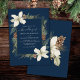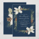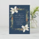 Cones de pinho de inverno e flores brancas em azul marinho com convite para casamento de guião elegante.