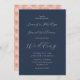 O convite de casamento rosa e marinho azul personalizado com uma fonte moderna de escrita e um lindo padrão de ouro rosa na parte de trás da carta. Personalize facilmente esses convites de casamento marinho e azul modernos com seus detalhes de casamento. Escolha perfeita para sua elegante queda, inverno ou festa de casamento da primavera.
