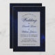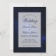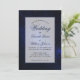 Este convite celeste tem como pano de fundo de um céu azul escuro estrelado à noite. O texto está num retângulo branco transparente. A ocasião "Casamento" e os nomes são escritos em um roteiro caligráfico azul elegante, o restante em pequenos bonés pretos.