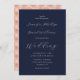 O elegante convite para casamento de ouro rosa e marinho azul com uma letra moderna e um lindo padrão de ouro rosa na parte de trás da carta. Personalize facilmente esses convites de casamento marinho e azul modernos com seus detalhes de casamento. Escolha perfeita para sua elegante queda, inverno ou festa de casamento da primavera.