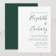 Este simples convite de casamento moderno mostra o texto verde esmeraldo em um fundo branco. Adicione os nomes da noiva e do noivo na caligrafia de escrita manual do na moda e os detalhes na fonte sans serif. O reverso é uma sombra de verde esmeralda sólido.